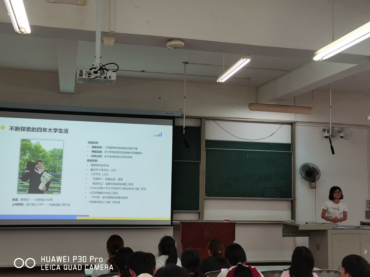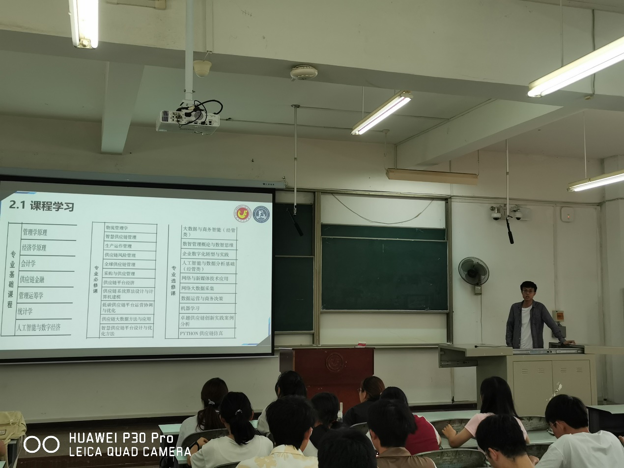 首先物流管理系胡振涛博士讲述了本专业的基本情况及相关发展方向,接着三位学长、学姐别讲述了各自在校成长历程。刘涛围绕着个人经历,讲述自己在校经历,就读西南交通大学的研究生经历,就职中铁大桥勘测设计研究院工作历程,勉励各位学弟学妹不要放弃梦想,勇于脚踏实地认真学好每一门课,早日胸怀梦想实现自己的目标。陈思仪和姜煜芃分别就规划四年大学学习、如何分段做好时间管理以及考研需要重点关注的点进行展开,两位学长和学姐都希望学弟学妹们可以提高自身的综合素质,多参加竞赛、社团活动,假期可以进入企业实习增加履历,并且祝愿学弟学妹们有一个丰富的大学生活。最后由物流管理系段李杰老师进行总结。