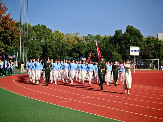 本网讯(通讯员:蔡豫琪 审核:颜宸)20251113日,第二十一届运动会在激昂的进行曲中正式开幕。开幕式现场彩旗招展、气氛炽热,各院系方队依次入场,其中工商管理学院方队的学子们,身着统一院服的学子们步伐铿锵有力,摆臂幅度、转向节奏分毫不差,利落的姿态里透着青春朝气,刚入场便收获了场边阵阵喝彩。