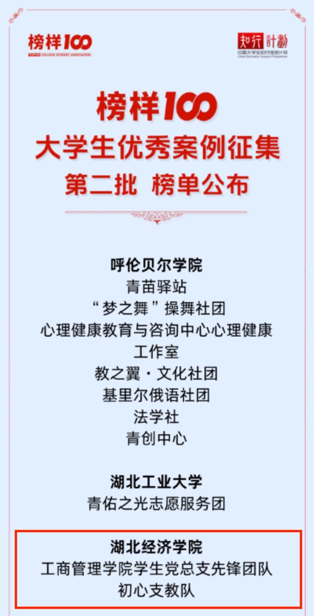 本网讯(通讯员 彭嘉琪 审核 车纯贤)近日,由中国大学生知行促进计划与青年影响力创新中心联合开展的2025“榜样100”大学生优秀案例征集活动结果公布。工商管理学院学生党总支“先锋团队”与初心支教队表现突出,双双获评优秀案例。