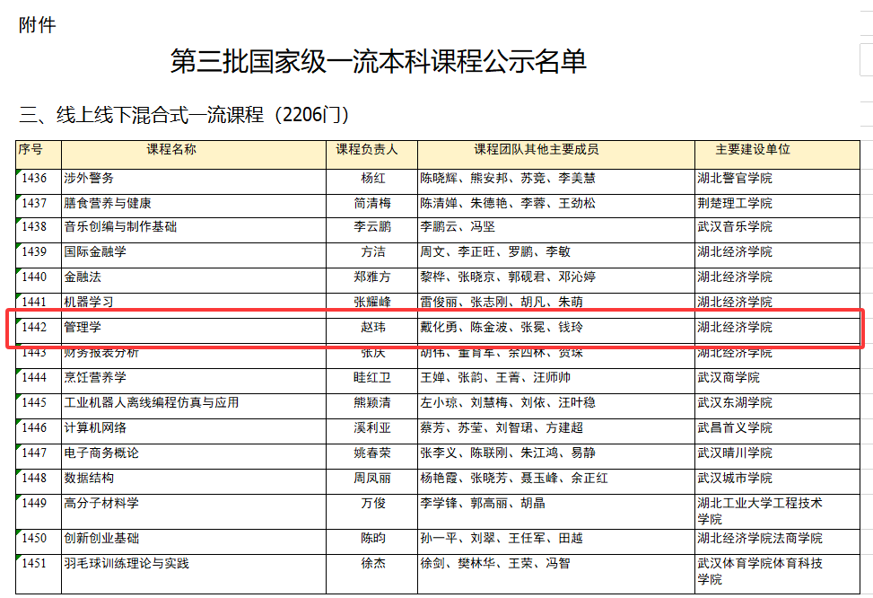(本网讯)近日,教育部正式公布了第三批国家级一流本科课程认定结果,湖北经济学院工商管理学院核心课程《管理学》成功入选,成为我校本批次获批的多项国家级一流本科课程之一。这一成果标志着我院在课程建设与人才培养方面再次取得新的重大突破。
